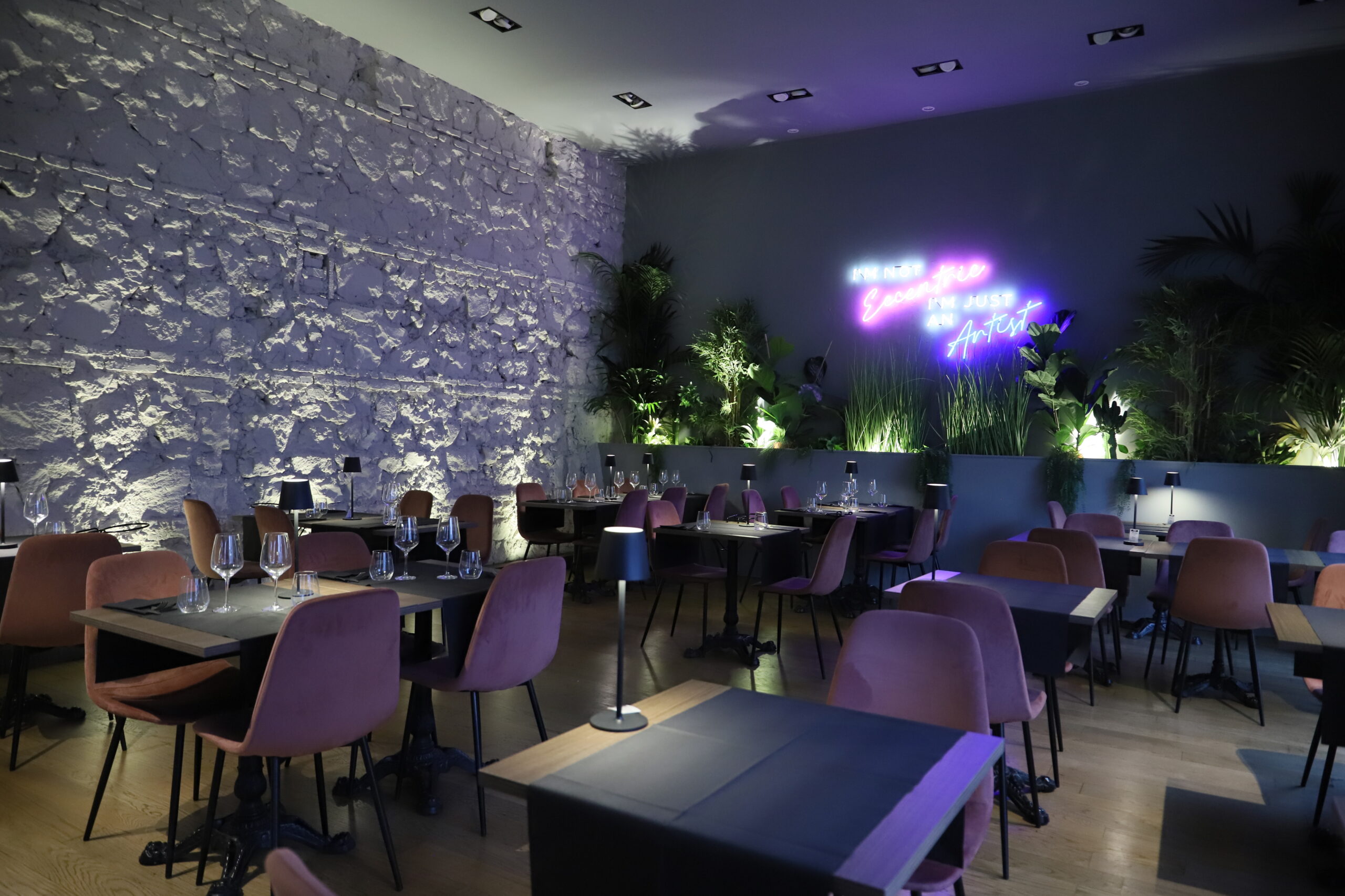 Il locale di 140 metri quadrati accoglie 52 coperti interni e 40 posti esterni. Qui però c’è la vera sorpresa del locale: una grotta naturale sotterranea dove, come in una taverna, accoglie fino a 30 ospiti. Lo spazio ideale per eventi privati o cene speciali. Tutto intorno poltroncine rosa, tavoli in legno e runner in stoffa nera con una mise en place curata e particolare. Il pavimento in parquet e l’alternanza tra le mura in pietra e quelle ricoperte da uno scenografico prato verde fiorito lo rendono il posto ideale per trascorrere serate piacevoli in compagnia. Canto però è anche musica ed eventi:due volte a settimana (mercoledì e venerdì/sabato) le cene spettacolo accoglieranno artisti di vario genere per allietare le cene degli ospiti con musica live. Canto è anche il posto ideale per un dopo cena, grazie al suo cocktail bar e all’interessante pairing food & cocktail. Ogni giorno invece, dalle 17:00 alle 21:00, si può ordinare un cocktail o un calice di vino gustando sfiziosità della cucina in versione finger food.